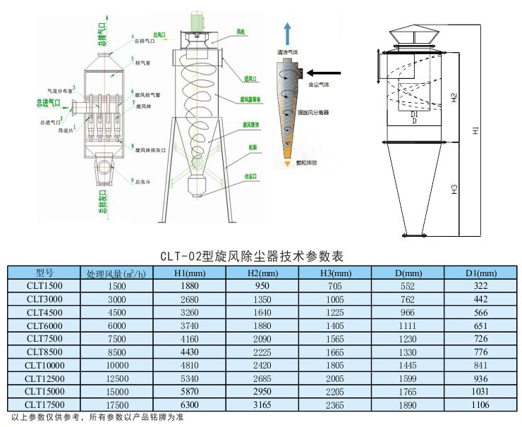 旋风式除尘器设备系列 工作原理: 旋风除尘器的原理是使含尘气流作高速旋转运动,利用惯性离心力的作用,将尘粒从含尘气流中分离出来,从而实现除尘的效果。 旋风除尘器内气流与尘粒的运动概况:进入旋风除尘器的含尘气流沿圆筒体内壁呈螺旋状由上向下向圆锥体底部运动,形成下降的外旋含尘气流,在强烈旋转过程中所产生的惯性离心力作用下,比重大的颗粒离心力也大,密度远远大于气体的尘粒甩向器壁,尘粒一旦与器壁接触,便失去惯性力而靠入口速度的动量和自身的重力沿壁面下落进入集灰斗。旋转下降的气流在到达圆锥体底部后,沿除尘器的轴心部位转而向上运动,形成上升的内旋气流,并由除尘器的排气管排出。