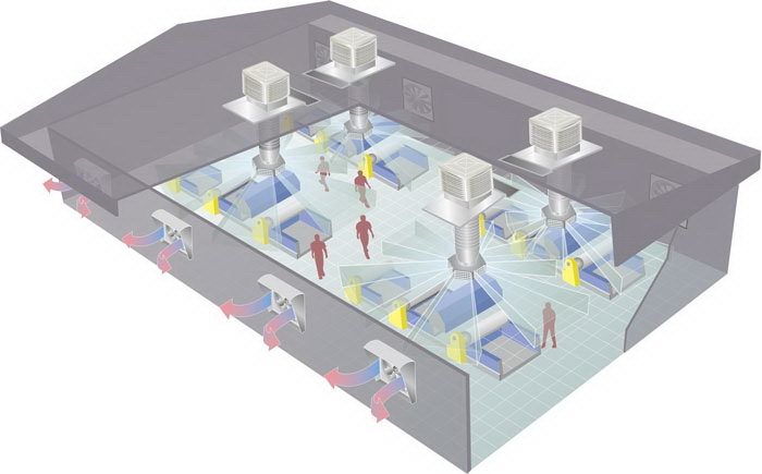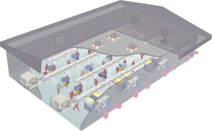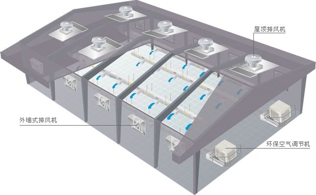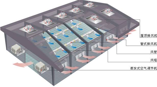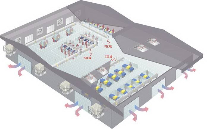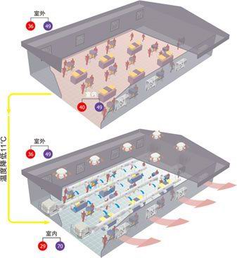 全方位的专业设计 厂房整体降温、区域降温、定点降温 整体降温 整体降温适用于: ■ 工人工位不固定 ■ 利用空间的增压防止灰尘的进入 ■ 厂房面积相对较小 ■ 注重环境的整体降温 ■ 热源可得到控制或受到限制 整体降温将带给整个厂房最大的舒适度,尤其适合工人工位不固定,需降温的设备或物品流动性大的车间。如在一些特定的区域需集中降温可增加定点降温,形成“整体—定点”降温模式 区域降温 -------------------------------------------------------------------------------- 区域降温适用于: ■ 厂房面积较大 ■ 工作区布局明显 ■ 工人及需降温的设备相对固定在某一区域 ■ 除工作区外不需降温 定点降温 -------------------------------------------------------------------------------- 定点降温适用于: ■ 工人工位相对固定 ■ 热源在整个空间散布 ■ 给工人最大舒适度 ■ 车间面积较大 ■ 最小成本设计 定点降温适合用于只需要降温的地方。如此,付出的成本最小 厂房降温系统原理