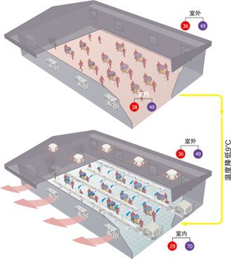 厂房降温系统组成部件 环保空调机与其他降温设备的对比 环保空调降温系统的安装成本约为传统空调的75%,运行成本约为传统空调的10%。 这是因为环保空调在工作时的蒸发式冷热交换,来自大气中的免费能量。 在您初次接触蒸发式降温系统之前,或许您已尝试过空调或离心风机系统,或者两者都已尝试过。但这两种方法都无法给您一个满意的结果,不是成本太高,就是效率太低。 传统中央空调降温系统 离心风机降温系统 环保空调降温系统 当车间生产的过程中,有热源产生或发热设备较多时,传统空调很难提供足够的冷量。而离心风机系统则是依靠一个大的离心风机以将外面的空气吹入,再通过通风管道输送到整个车间。 这种方法在炎热的天气时一样无法凑效。其原因是将外面已经很热的空气吹进来对环境降温同样没有效果。 上图例是环保空调降温系统与传统空调的对比清楚地表明在运行成本上的巨大差异(12.5%对100%)。当你有一个大的生产车间需要降温时,不断上升的能源消耗将花费您高额的费用。 环保空调机组降温效果数据 我们以数据列表及图解方式来对比说明厂房在安装开放式降温系统前后的工人感受的温度。 无热源车间 当室外温度为36℃、相对湿度为49%时,无热源产生的车间内温度达到38℃、湿度49%,当使用环保空调开放式降温系统可将温度降到29℃、湿度70%,车间温度降低了9℃。 有热源车间 当室外温度为36℃、相对湿度为49%时,有热源产生的车间内温度达到40℃、湿度49%,当使用环保空调开放式降温系统可将温度降到29℃、湿度70%,车间温度降低了11℃。