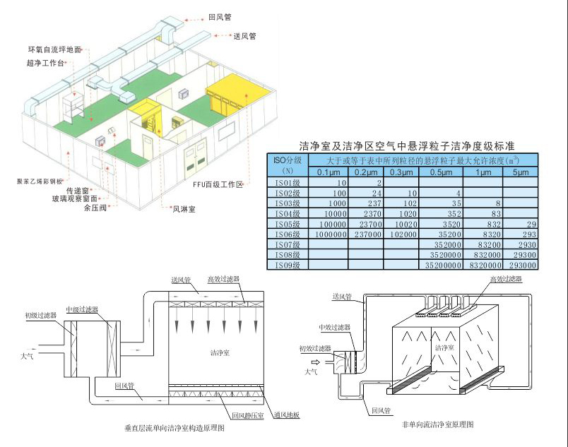 洁净室一般按照室内的气流形态进行分类。主要有:单向流(层流、活塞流)洁净室、乱流(非层流)洁净室、混合方式(乱流、层流同在)。单向流(层流)洁净室内,从送风口到回风口,气流流经途中的断面几乎没有什么变化,全室断面上流速比较均匀,流线单向平行,没有涡流。乱流洁净室基本就是稀释净化,干净气流不断从送风口送入,稀释着室内四周污染的空气,回风口不断排走污染空气。气流扩散得越快,越均匀,稀释的效果就越好,室内洁净度就越高。
