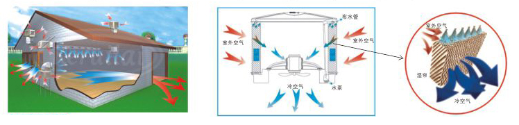 "科瑞莱"蒸发式冷风机的核心降温部件是高效蒸发冷却湿帘—"纯天然多层波纹植物纤维叠合物"。根据"水蒸发吸收热量,蒸发面积影响蒸发效率"这一自然物理现象,通过风机使机内产生负压,室外的空气流经浸水的湿帘后空气与水份充分接触,水份蒸发同时吸收空气中的热量,风机将降温后的空气输送到室内,将室内高温有异味、粉尘和浑浊闷热的空气排挤出室外,同时兼顾换气、降温及增加空气含氧量等多种效果,适用于开敞式及半开敞式环境,特别是高温及人群密集场所。