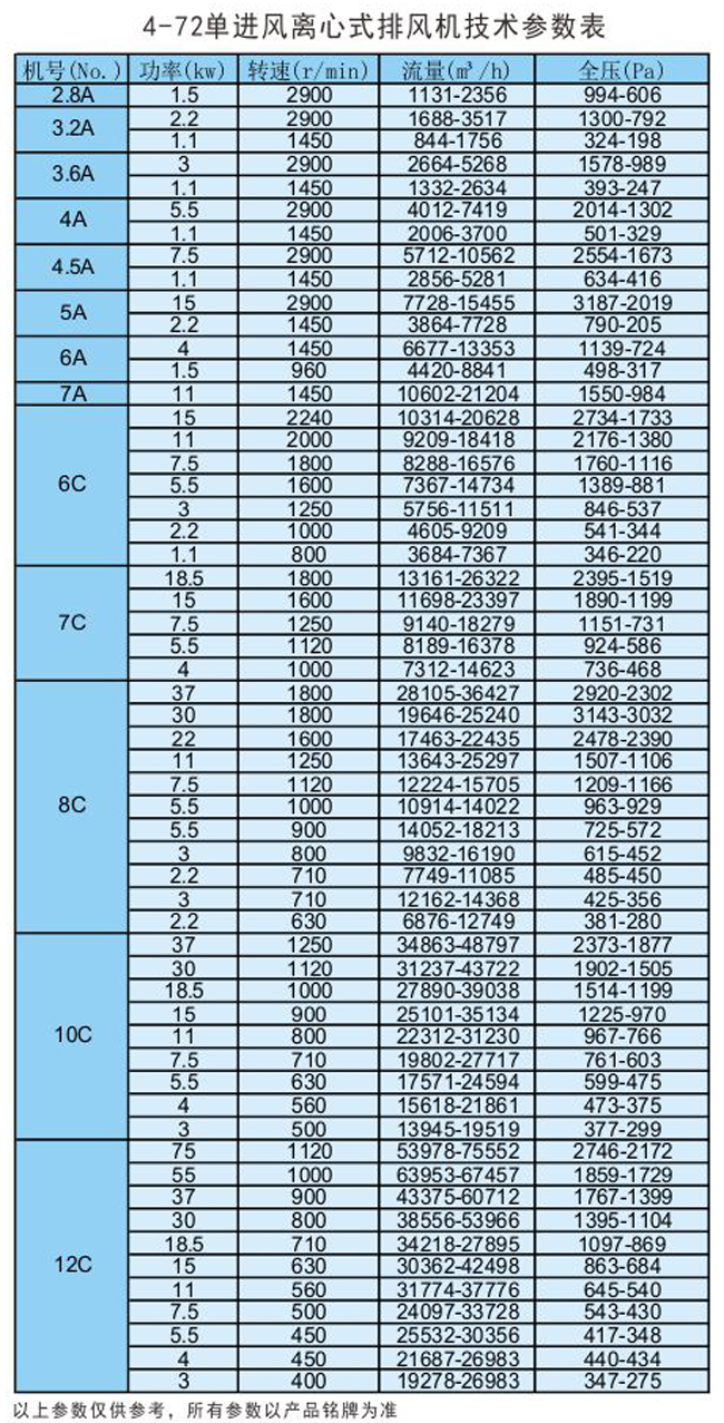 4-72型离心通风机具有高效率、噪声低、压力曲线平衡、使用范围广等特点,可作为一般工厂及大型建筑物的室内通风换气用,输送空气和其他不自燃的、对人体无害的、对钢材无腐蚀性的气体。广泛用于厂矿企业、体育馆、歌剧院、地下室、大小宾馆、酒楼、商场及大型建筑的室内通风换气,降温除尘等,也可用于与其他各类机械设备配套作气体循环使用。输送的气体内不许有粘性物质,所含的尘土及硬质颗粒不大于150mg/m